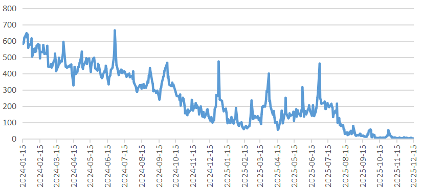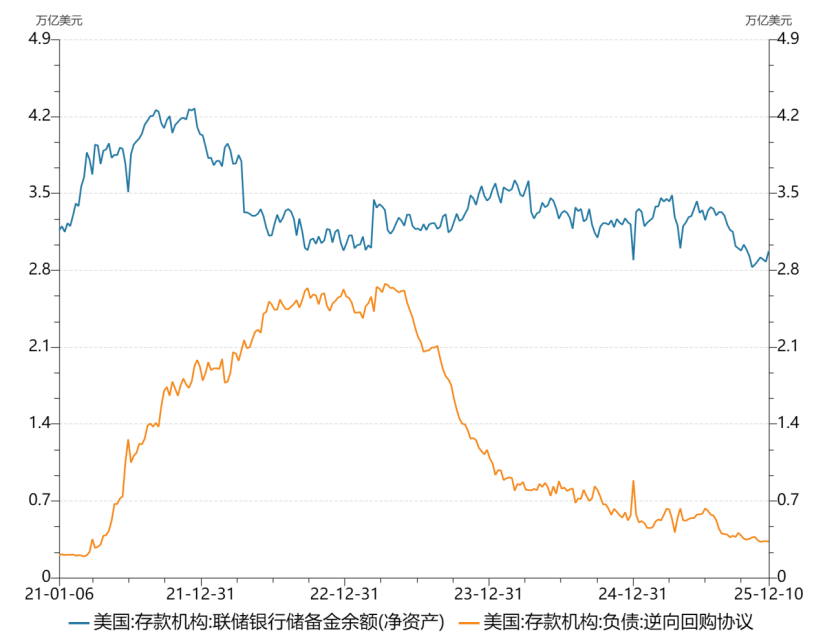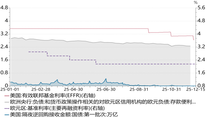 美联储、欧央行流动性收紧,美元逆回购使用规模波动放大、季末跳升的特征突出。2025年全年,美联储缩表0.31万亿美元,欧央行缩表0.28万亿欧元,代表美国银行体系流动性的储备金规模自3.3万亿美元逐步下降至2.97万亿(截至2025年12月10日),代表美国非银机构流动性水平的隔夜逆回购使用量自年初2,398亿美元下降至26亿美元。尤其是,美联储隔夜逆回购的使用量波动剧烈,在使用量缩减前,逢月末季末显著增加,例如,3月31日和6月30日使用量分别为4000和4600亿美元,显著高于当月均值1700-1800亿美元,隔夜逆回购使用量自7月快速下降,在10月以后降至100亿以下,使用量出现实质萎缩;欧元方面,代表欧元银行体系流动性的存款便利工具余额自2025年年初2.92万亿下降至2.47万亿欧元(截至2025年12月16日当周)。