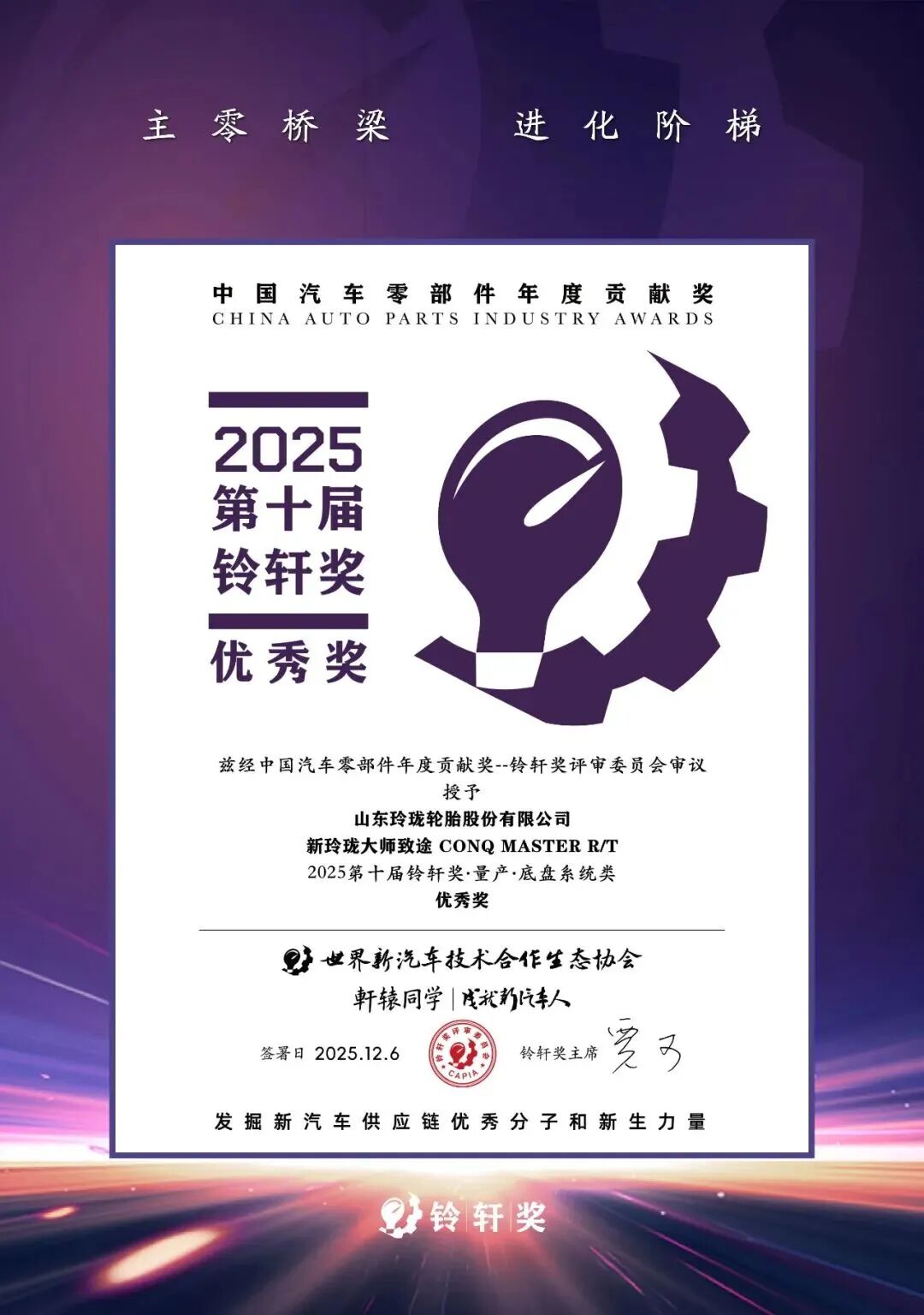 12月6日,第十届铃轩奖颁奖典礼在苏州揭晓。在为期半年、经过29位专家严格评审的激烈角逐中,玲珑轮胎从百余项申报中脱颖而出,斩获双项大奖:“废旧轮胎制备液体再生胶可循环轮胎应用技术”荣膺前瞻类优秀奖,“新玲珑大师致途”夺得量产类优秀奖。玲珑第六次成为该汽车零部件权威奖项唯一获奖轮胎企业,彰显了其持续领先的创新能力。